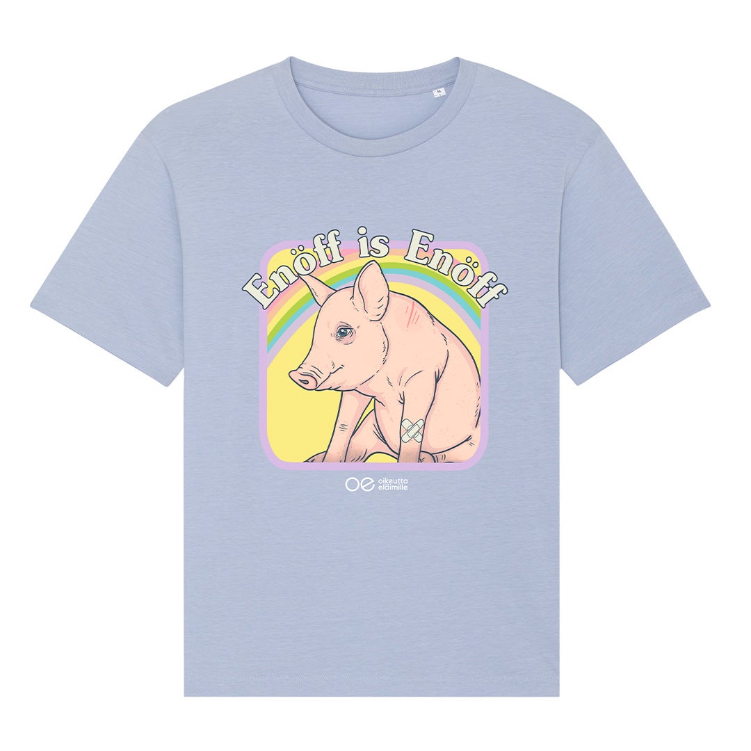 Enöff is Enöff -t-paita oli osana vuonna 2022 järjestettävää sikakampanjaa, jonka tavoitteena oli nostaa esille lukemattomat siat, jotka joutuvat viettämään koko elämänsä likaisissa ja ahtaissa tiloissa vailla virikkeitä. Kampanjassa otimme samalla kantaa surkeaan eläinsuojelulain uudistukseen, joka tulee suurelta osin jättämään huomiotta tuotantoeläimet, joiden olot ovat surkeimmat.